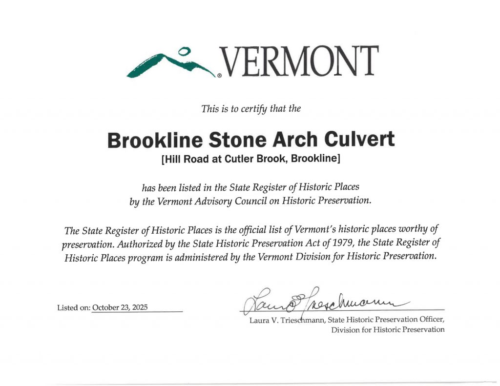 On October 23, 2025, the Vermont Advisory Council on Historic Preservation voted to list the Brookline Stone Arch Culvert in the State Register of Historic Places, the state’s official list of historic properties significant to the history of Vermont.