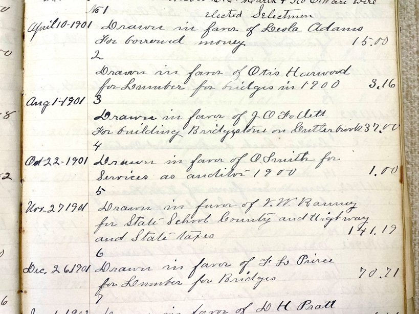 In addition to the construction methods linking this bridge to Follett there is a reference in the town’s Treasure’s Disbursement Journal for a payment to J.O. Follett in 1901 for “building bridge, stone on Cutler brook”.
