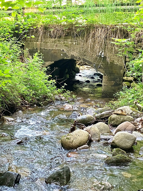 The Brookline Stone Arch bridge is a segmental arch stone and concrete culvert constructed in 3 sections with large boulder wingwalls. The c. 1901 14’ section is on the downstream side. Moving upstream is a narrow stone and concrete expansion and then on the upstream side is a c.1960 concrete culvert. A basic visual assessment of the bridge was performed by stone mason Brian Post on Feb 7th 2025 and again on May 17th 2025. Based on these assessments the downstream section was the original bridge and each subsequent section widened the bridge upstream. The following description consists principally of text from his Brookline Stone Arch Bridge Revised Assessment Report with supplementary descriptions.